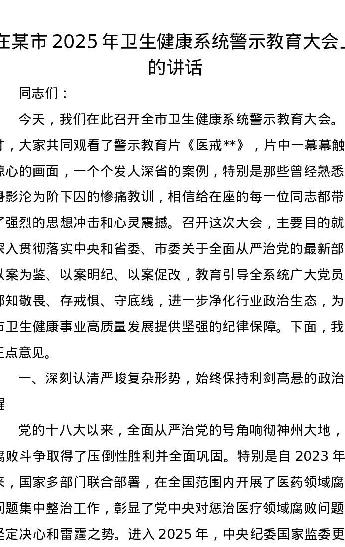 在某市2025年卫生健康系统警示教育大会上的讲话