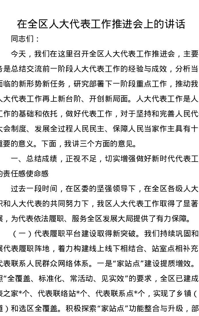 在全区人大代表工作推进会上的讲话
