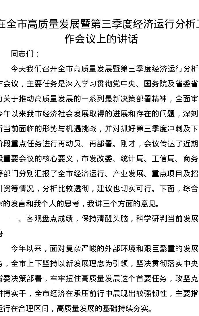 在全市高质量发展暨第三季度经济运行分析工作会议上的讲话