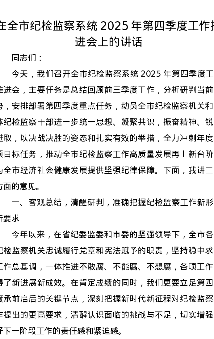 在全市纪检监察系统2025年第四季度工作推进会上的讲话
