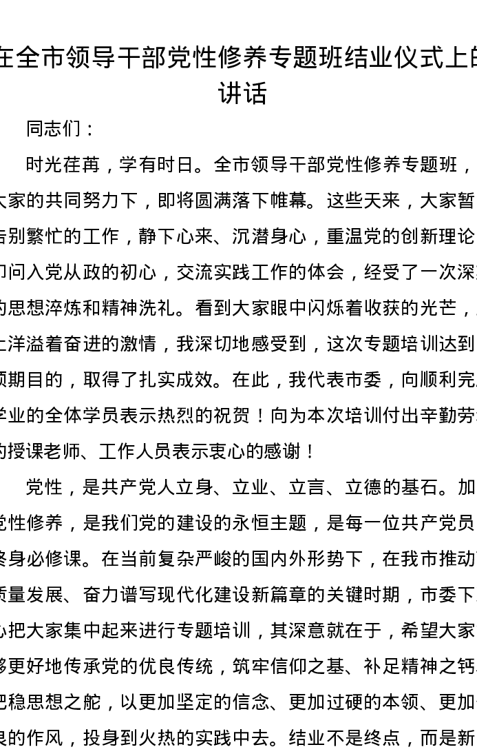 在全市领导干部党性修养专题班结业仪式上的讲话
