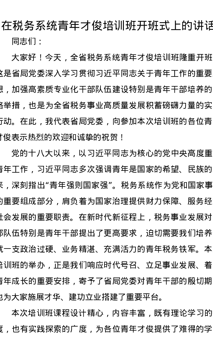 在税务系统青年才俊培训班开班式上的讲话