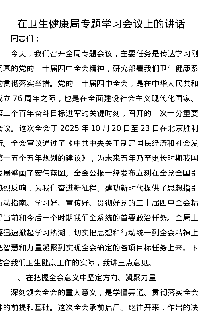 在卫生健康局专题学习会议上的讲话