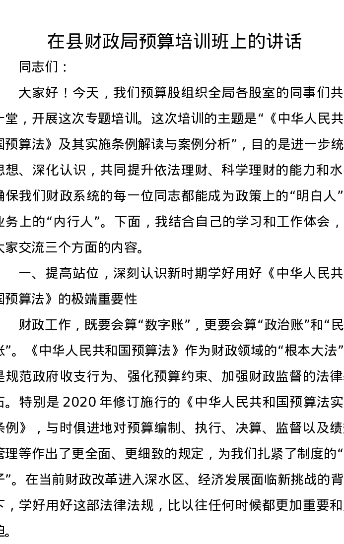在县财政局预算培训班上的讲话