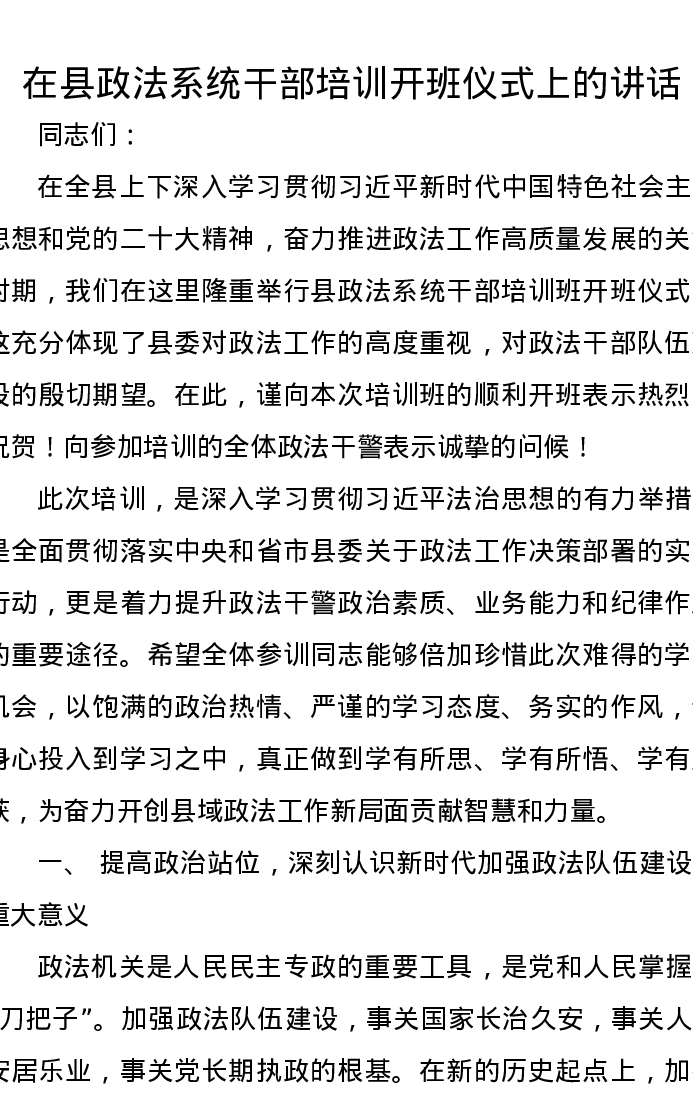 在县政法系统干部培训开班仪式上的讲话