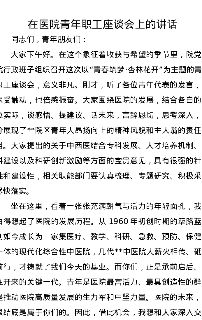 在医院青年职工座谈会上的讲话