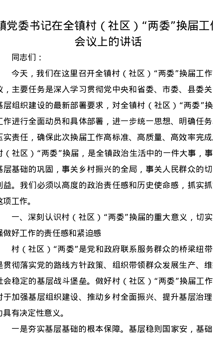 镇党委书记在全镇村(社区)“两委”换届工作会议上的讲话