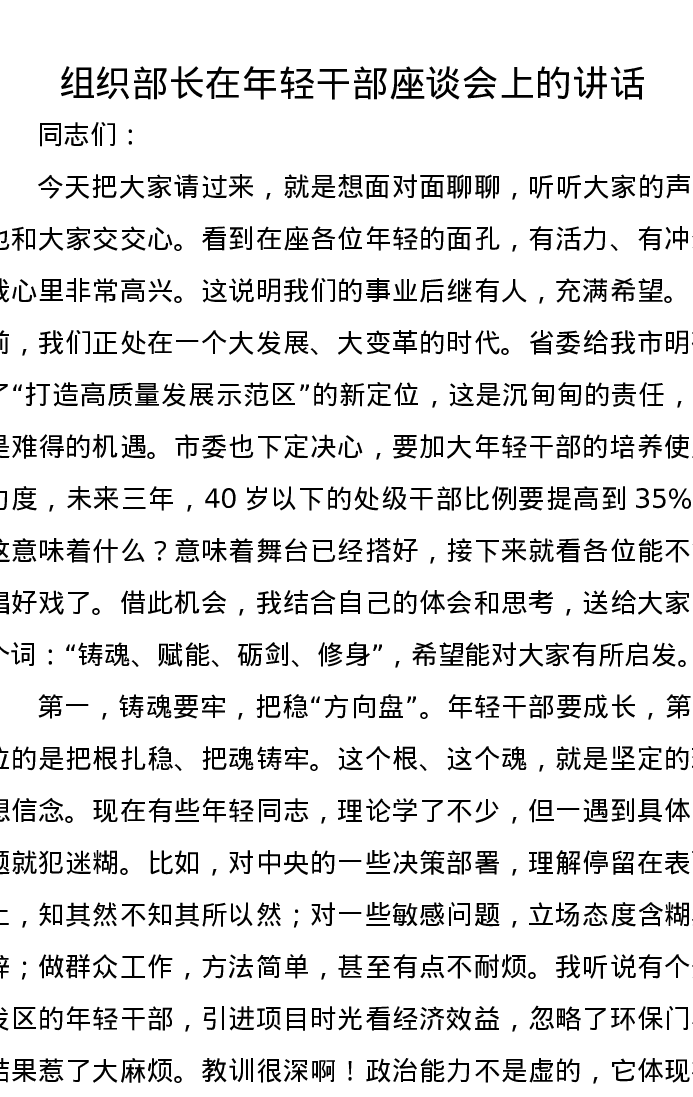 组织部长在年轻干部座谈会上的讲话