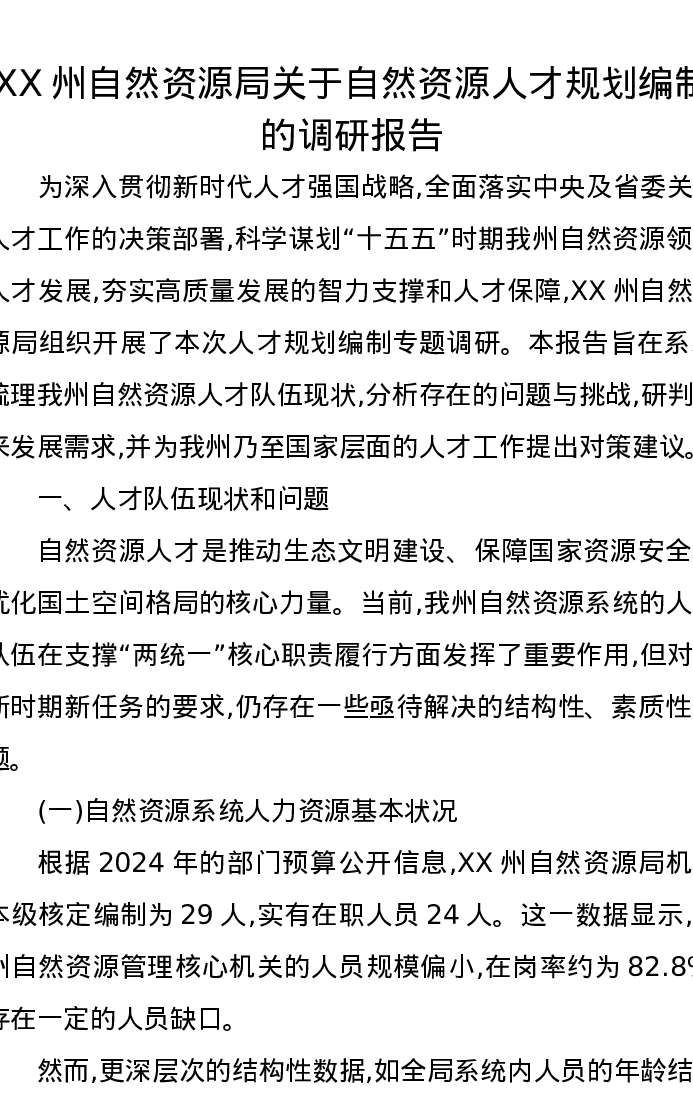 XX州自然资源局关于自然资源人才规划编制的调研报告
