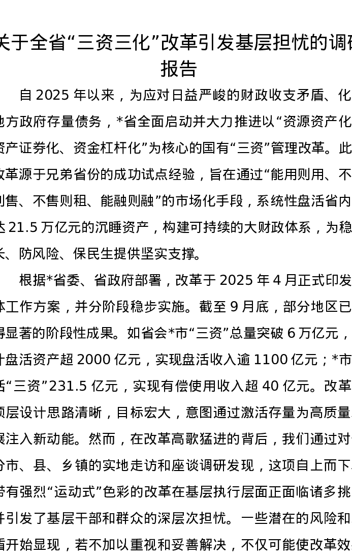 关于全省“三资三化”改革引发基层担忧的调研报告