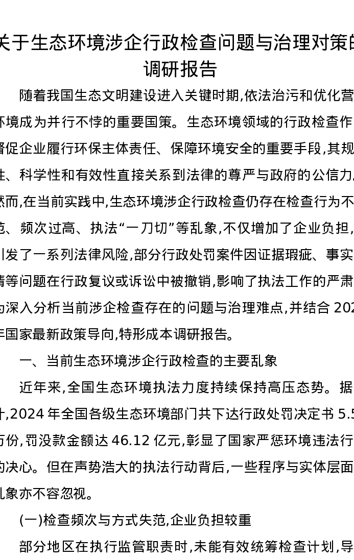 关于生态环境涉企行政检查问题与治理对策的调研报告