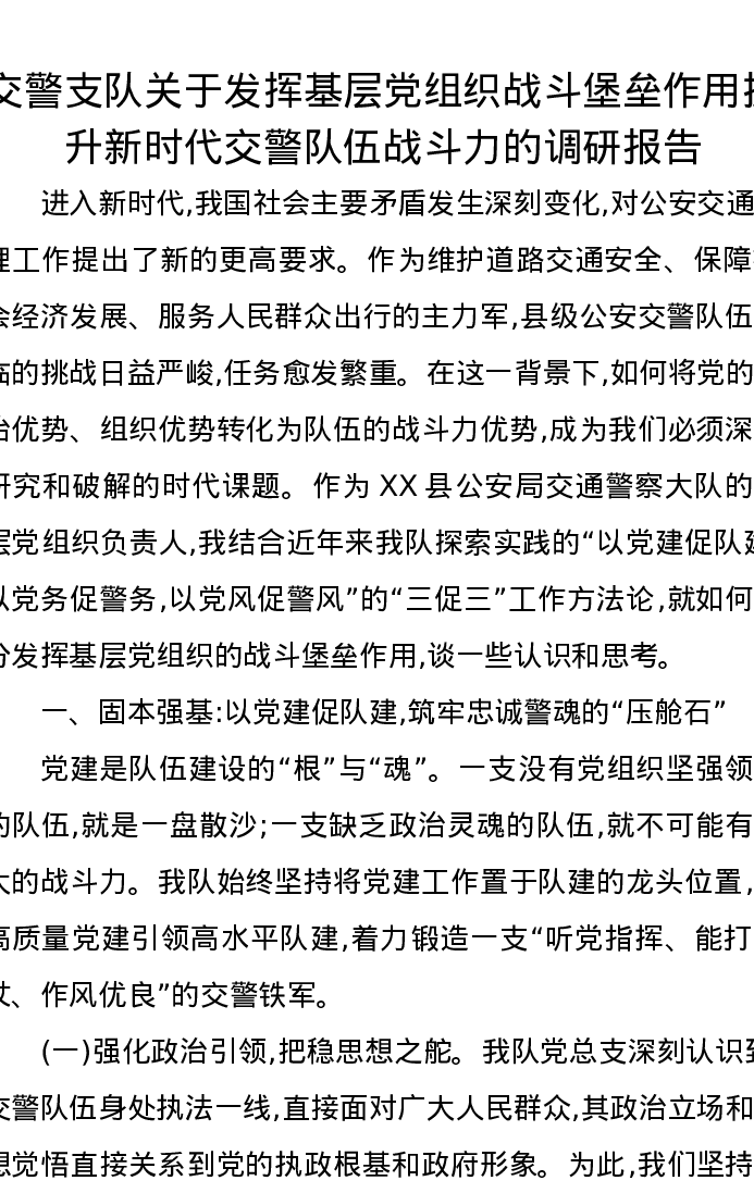 交警支队关于发挥基层党组织战斗堡垒作用提升新时代交警队伍战斗力的调研报告