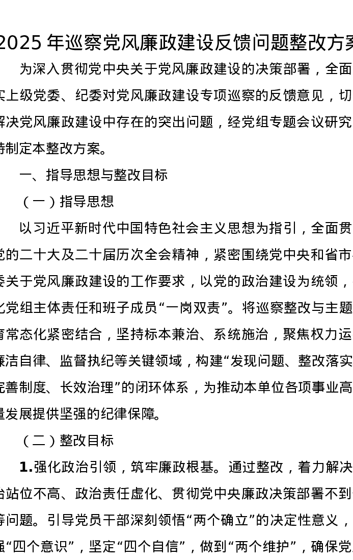 2025年巡察党风廉政建设反馈问题整改方案