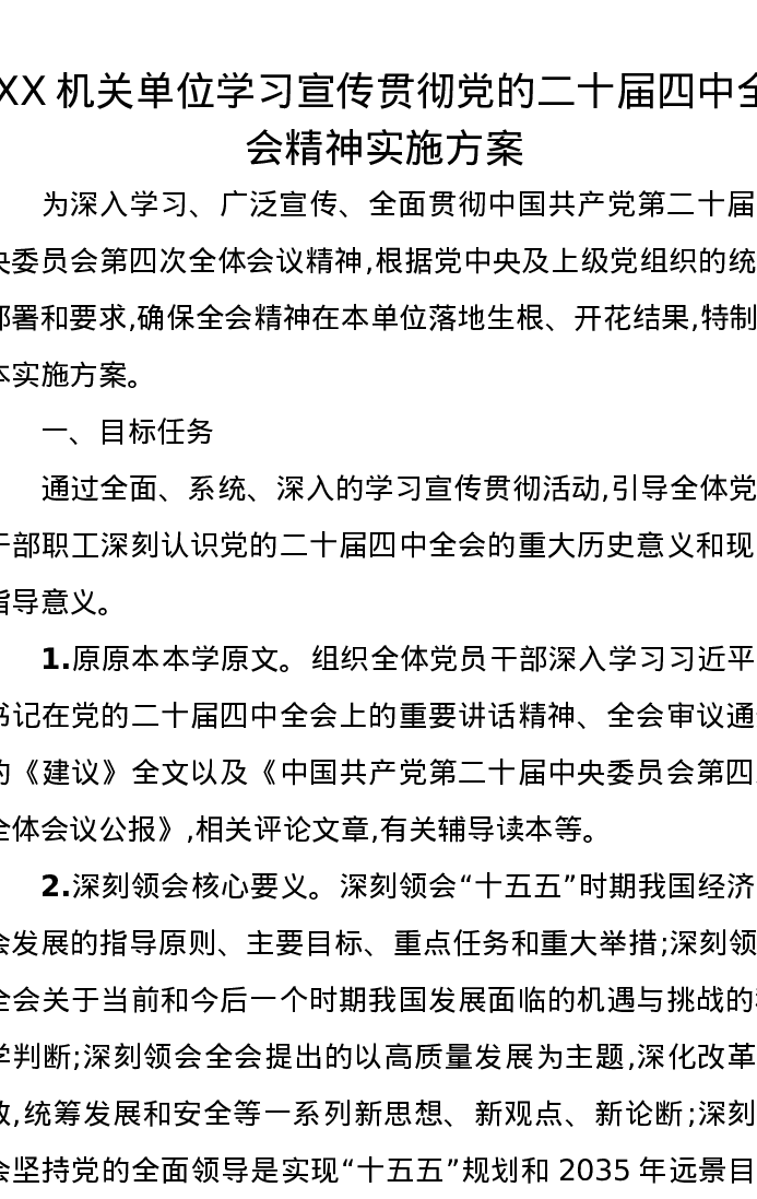 XX机关单位学习宣传贯彻党的二十届四中全会精神实施方案