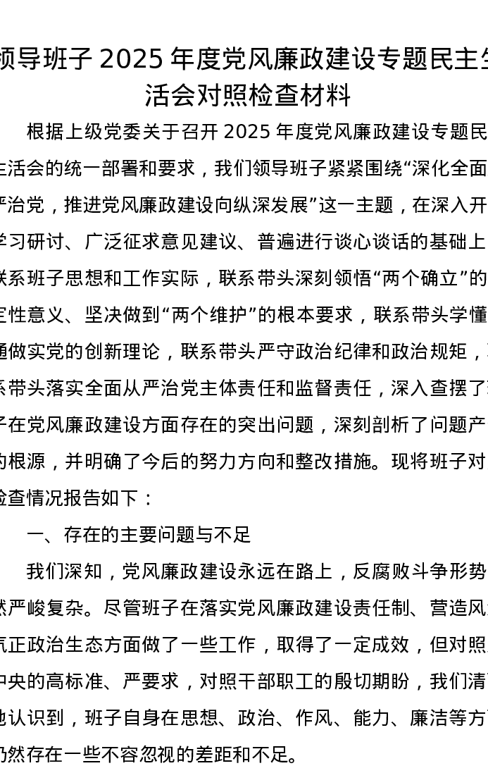 领导班子2025年度党风廉政建设专题xxxxx对照检查材料