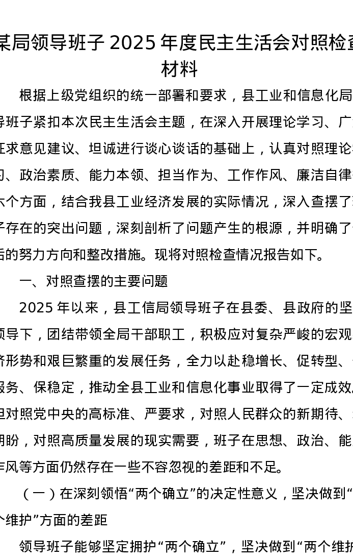 某局领导班子2025年度xxxxx对照检查材料