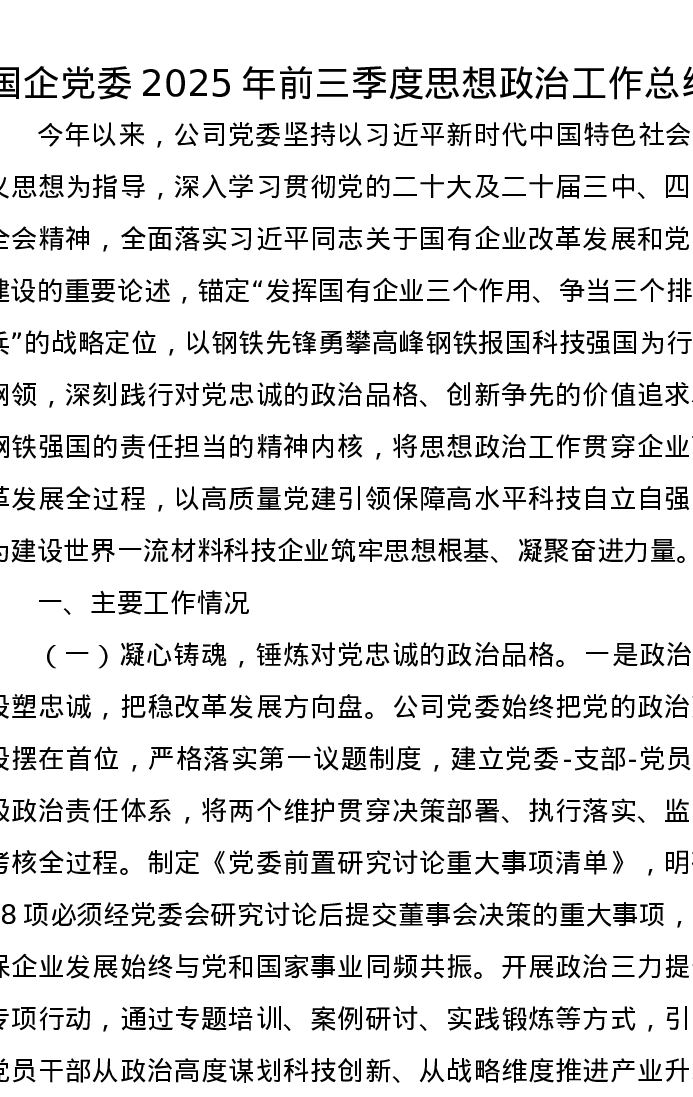 国企党委2025年前三季度思想政治工作总结