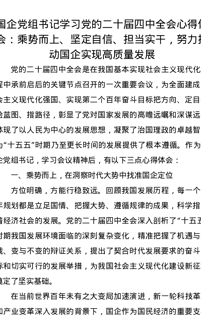 国企党组书记学习党的二十届四中全会心得体会:乘势而上、坚定自信、担当实干,努力推动国企实现高质量发展