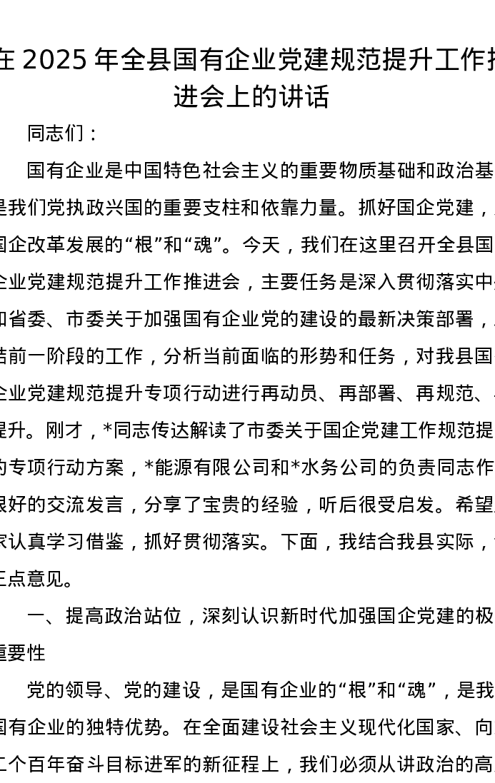 在2025年全县国有企业党建规范提升工作推进会上的讲话