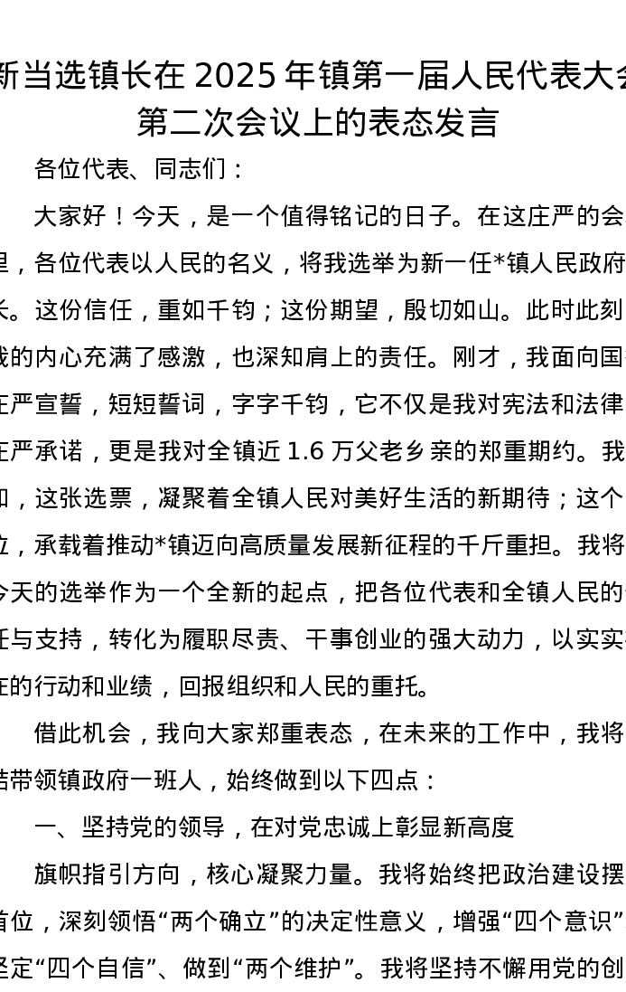 新当选镇长在2025年镇第一届人民代表大会第二次会议上的表态发言