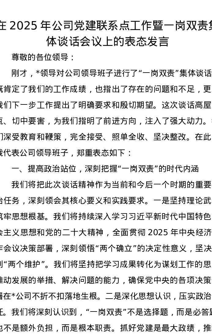 在2025年公司党建联系点工作暨一岗双责集体谈话会议上的表态发言