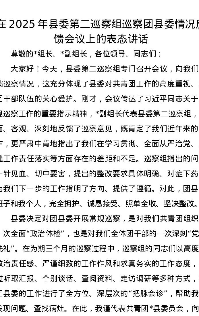 在2025年县委第二巡察组巡察团县委情况反馈会议上的表态讲话