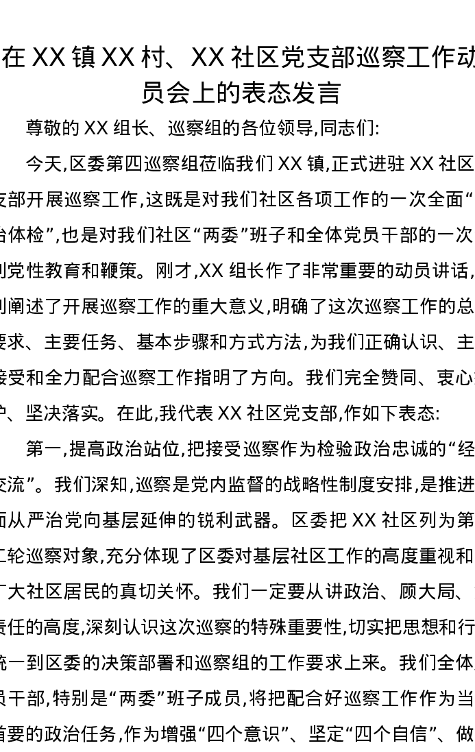 在XX镇XX村、XX社区党支部巡察工作动员会上的表态发言