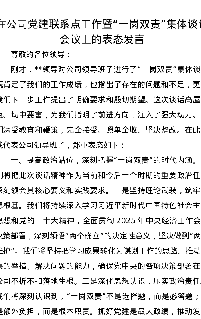 在公司党建联系点工作暨“一岗双责”集体谈话会议上的表态发言