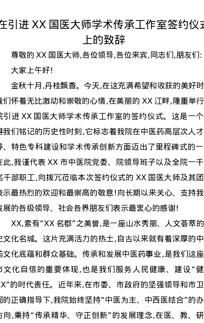 在引进XX国医大师学术传承工作室签约仪式上的致辞