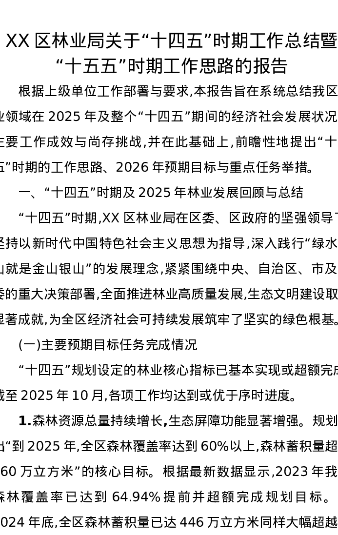 XX区林业局关于“十四五”时期工作总结暨“十五五”时期工作思路的报告