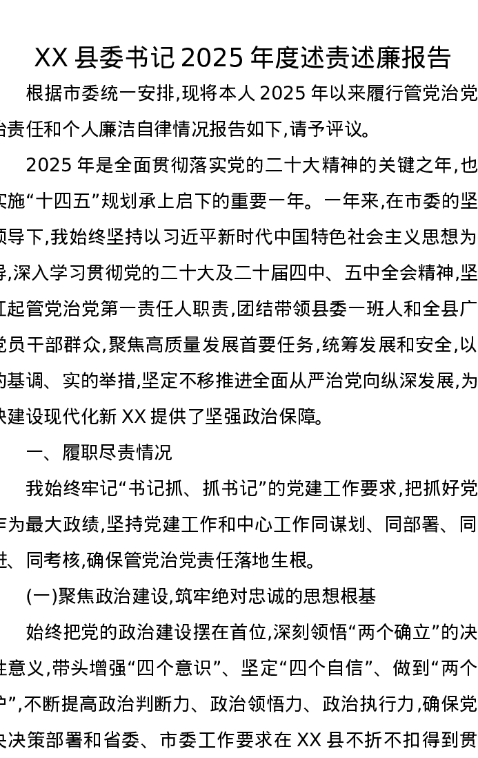 XX县委书记2025年度述责述廉报告