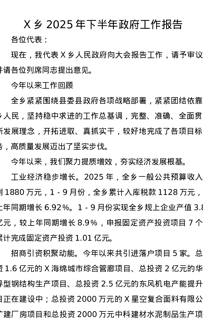 X乡2025年下半年政府工作报告
