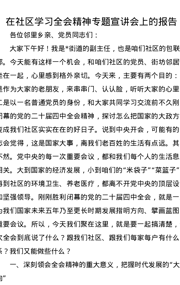 包联社区干部在社区学习二十届四中全会精神专题宣讲会上的报告