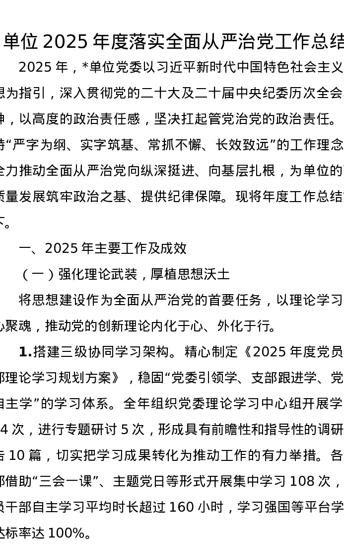 单位2025年度落实全面从严治党工作总结