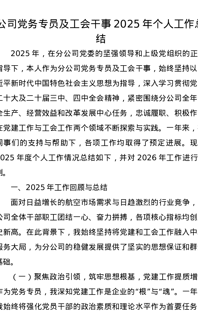 公司党务专员及工会干事2025年个人工作总结