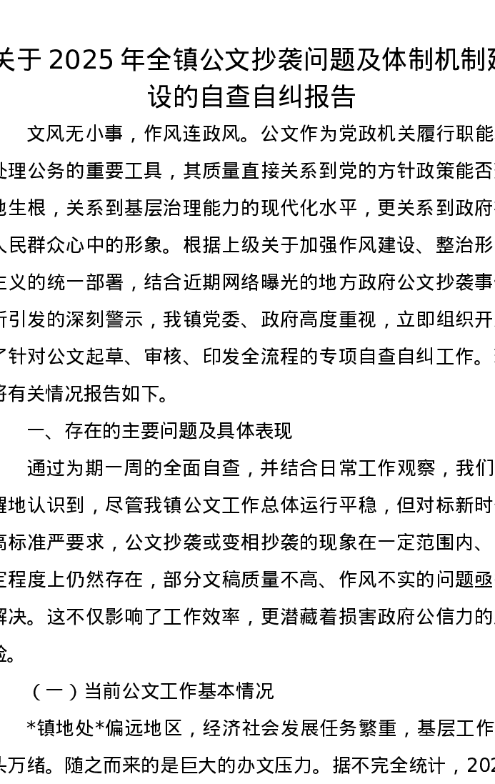 关于2025年全镇公文抄袭问题及体制机制建设的自查自纠报告
