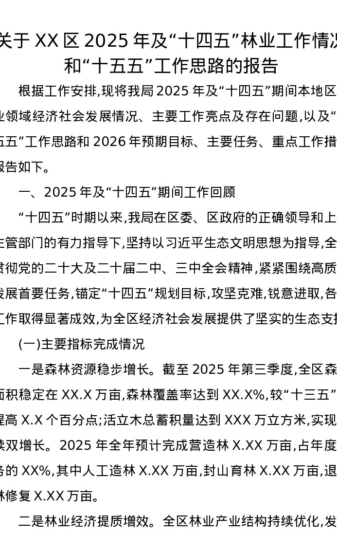 关于XX区2025年及“十四五”林业工作情况和“十五五”工作思路的报告