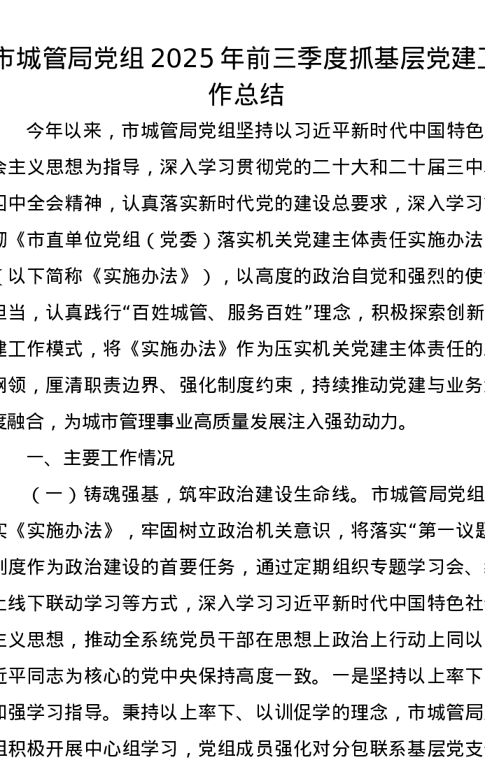 市城管局党组2025年前三季度抓基层党建工作总结