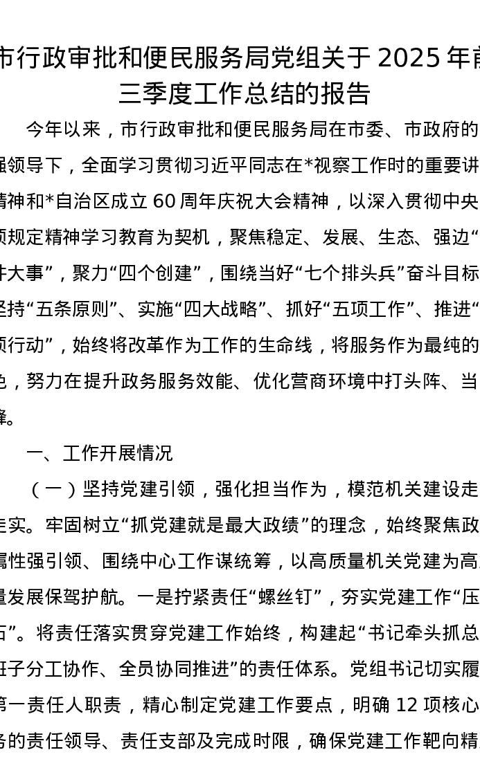 市行政审批和便民服务局党组关于2025年前三季度工作总结的报告