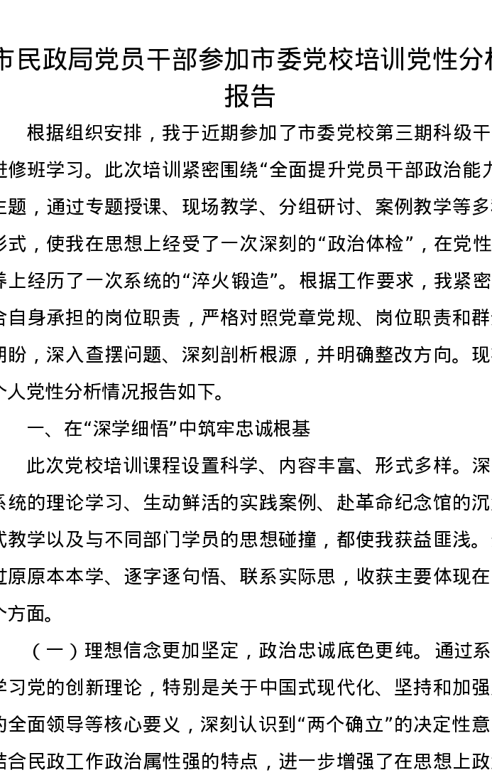 市民政局党员干部参加市委党校培训党性分析报告