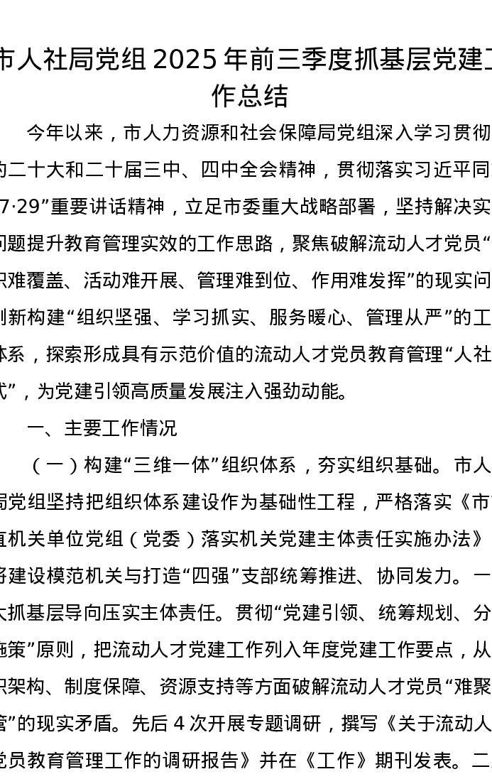 市人社局党组2025年前三季度抓基层党建工作总结