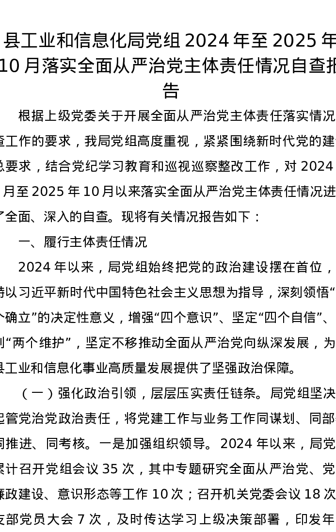 县工业和信息化局党组2024年至2025年10月落实全面从严治党主体责任情况自查报告