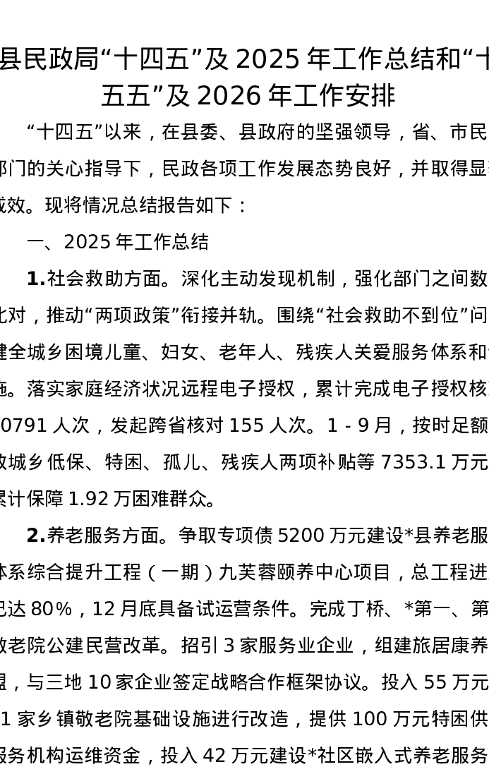 县民政局“十四五”及2025年工作总结和“十五五”及2026年工作安排