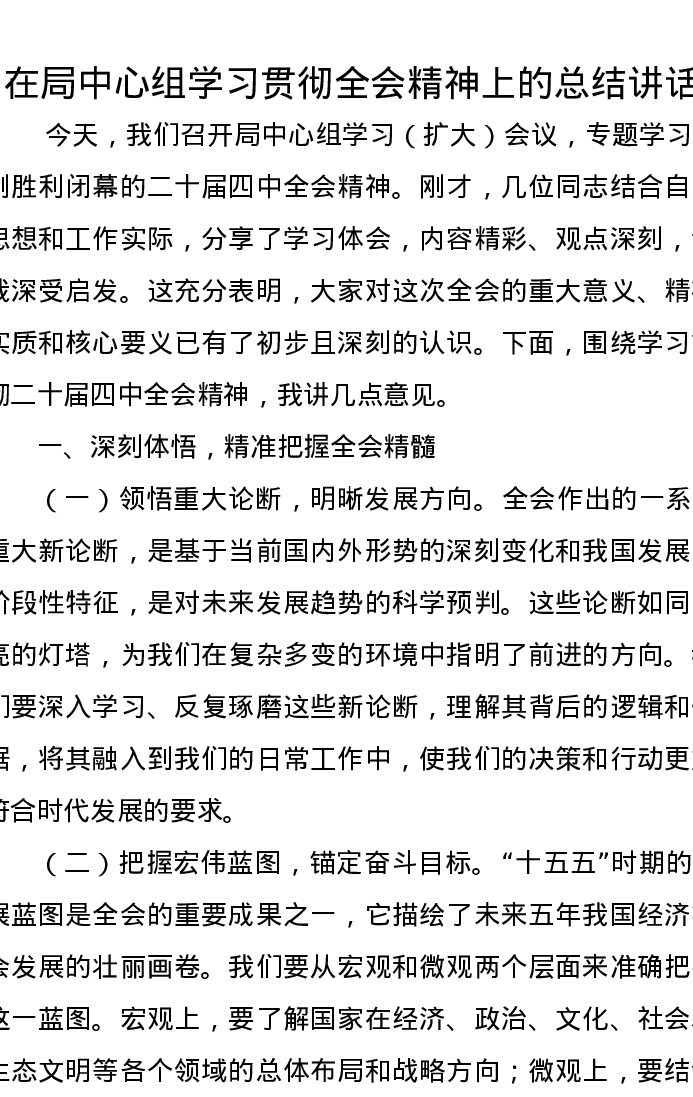在局中心组学习贯彻二十届四中全会精神上的总结讲话