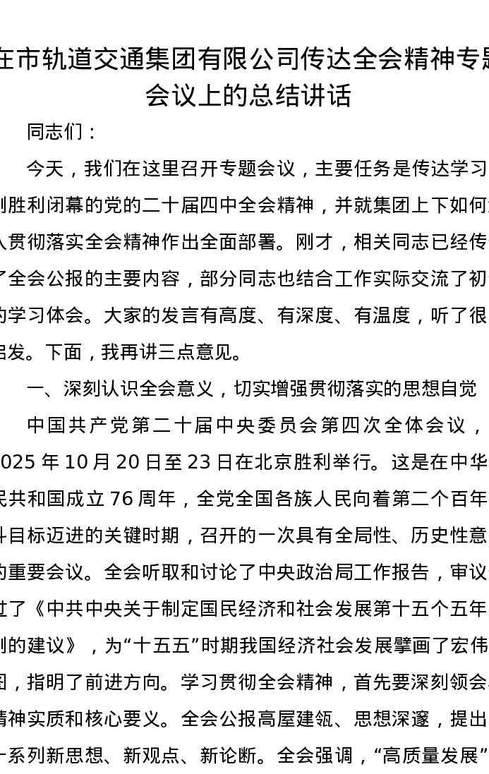 在市轨道交通集团有限公司传达全会精神专题会议上的总结讲话