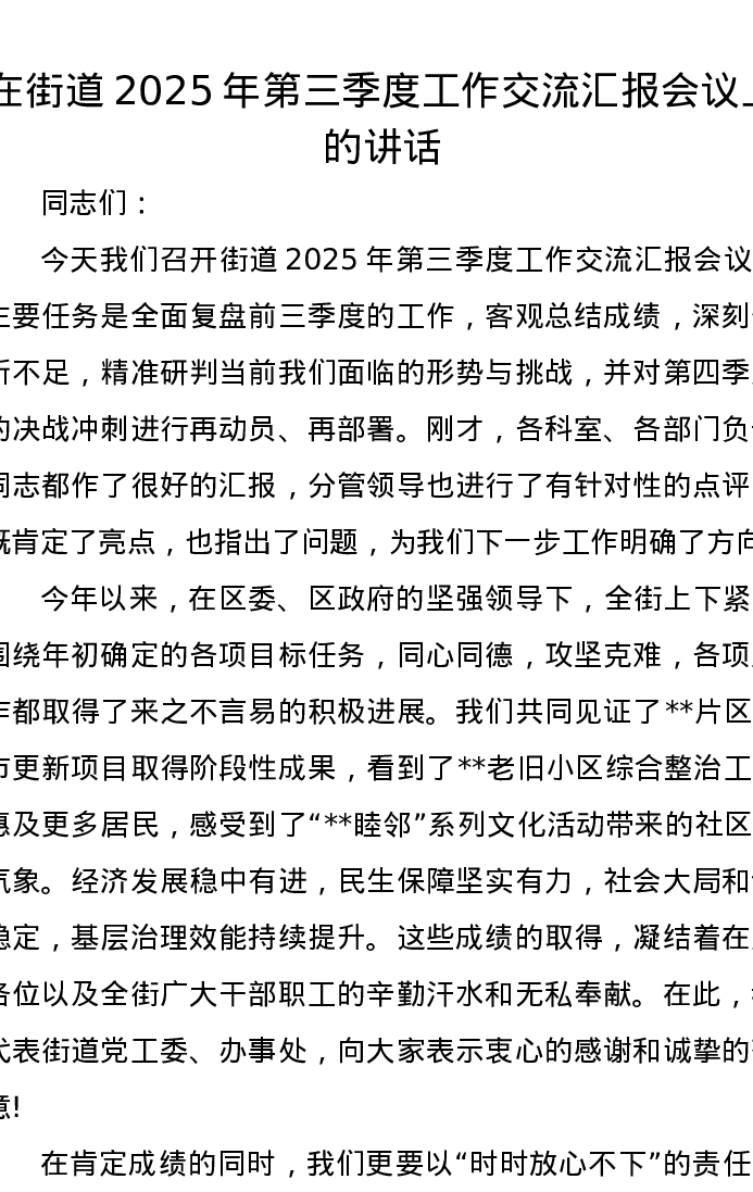 在街道2025年第三季度工作交流汇报会议上的讲话