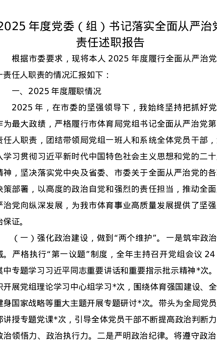 2025年度党委(组)书记落实全面从严治党责任述职报告
