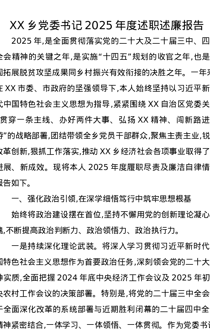 XX乡党委书记2025年度述职述廉报告