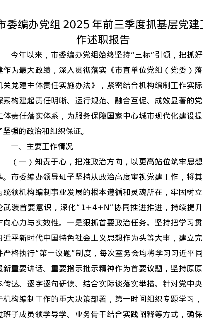 市委编办党组2025年前三季度抓基层党建工作述职报告