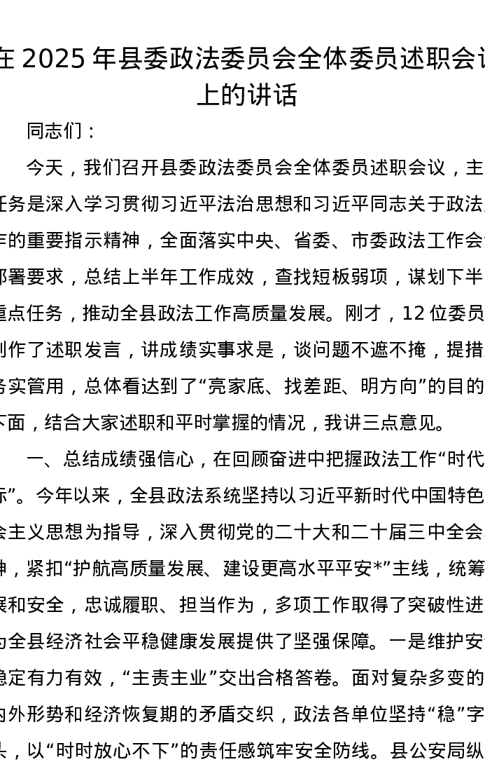 在2025年县委政法委员会全体委员述职会议上的讲话